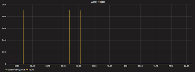 Granted, it's not much to look at. The heater only turned on three times, and even then, it was only for a minute. Slow day around here, but notice that the spikes are 4500 watts. This thing can really pull the power; remember, the solar is running also.