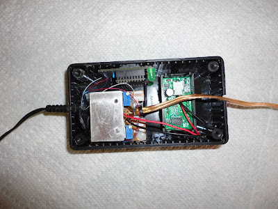 Yes, I finally assembled and tested the various ideas into a single box for my float charger for lead acid batteries. This project has been going on for over a year now and may be getting close to having a nice working prototype. I incorporated a voltage display and an XBee set up to transmit analog readings into the mix. So, what happens is you plug the charger into the wall and the XBee comes on, samples the voltage before the output diode and sends it to whatever device you set it up to talk to. This way I can monitor the battery state of charge remotely without even having to go into the garage. Here's an interior view of the charger: