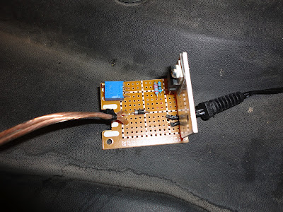 The input on the left is the wall wart's 19 VDC (apx) output; VR1 is a 1K, 25 turn potentiometer I picked up on eBay; R2 is 1.2K; and R3 is 180 ohms. This gives the charger a range of about 9.6 to 16 or so volts. To calibrate it, I put a 1K resistor across the output, set it for 13.4 volts and then took the resistor off. When I hooked it to the battery, it floated the battery up to 13.37 volts over an hour or so and just held it there.